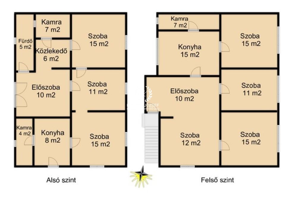 Az ingatlan 2 szinten, közel 170 m2-en, 7 szobával, 2 konyhával és 1 fürdővel rendelkezik jelenleg. Mivel azonban van 3 kamrája és az egyik pont a felső konyha mögött van, így egy emeleti fürdőt könnyen ki lehet alakítani, ráadásul a régit sem kell lebontani.