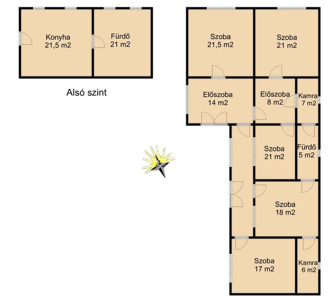 Az ingatlan kőből épült, pala tetővel rendelkezik és a felső szinten összesen 5 szoba, az alsó szinten pedig 1 konyha és egy fürdő található.