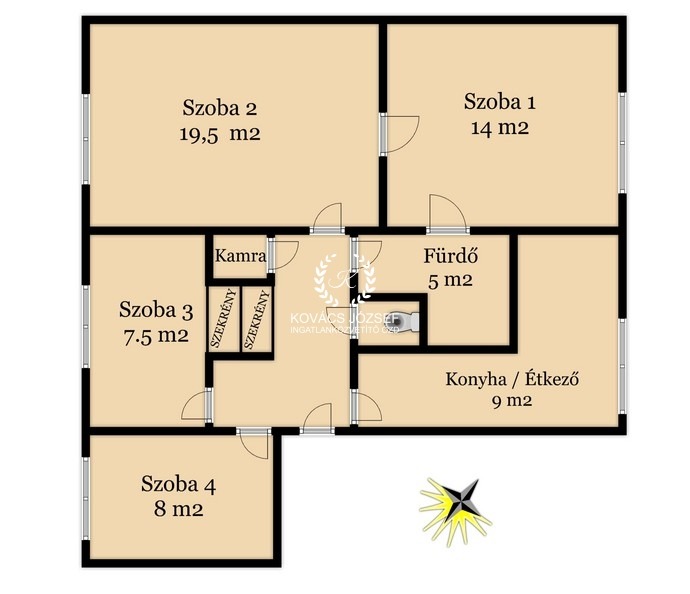 2 nagyobb szoba és egy 7,5 valamint egy 8 m2-es szoba tökéletes alapot kínál egy család számára, ráadásul a konyha elég tágas egy étkező asztalhoz, van külön kamra és a wc is külön van a fürdőtől.