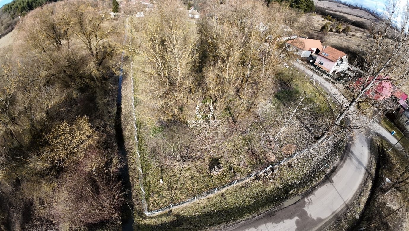 A másik telek 7990 m2 és gyakorlatilag néhány fa van rajta és a hosszabbik oldalán fut egy patak. (Lásd légifotó.)